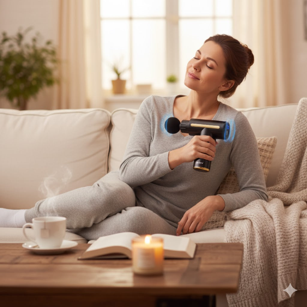 This soothing massage moment shows how easy it is to unwind with your device right at home. The gentle percussion helps release neck and shoulder tension while you relax comfortably in your favorite space. It’s the perfect way to reset after a long day, improve circulation, and ease tight muscles without leaving your couch. Enjoy instant comfort and a calmer mind with every session.